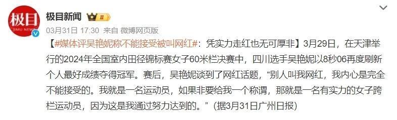 赛后经受广州日报的采访时,吴艳妮故意提到了我方的主张即是过问奥运会,吴艳妮暗意我方是又名劳动通顺员,锻真金不怕火100米栏的主张即是为国设置奥运会,而我方也用硬实力完成了这个主张,仅仅我方惟一不可经受的,是网友们对我方的一个称呼:网红!这是吴艳妮皆备不可容忍的,况且她在说这句话的时辰,很赫然心理里带着大怒